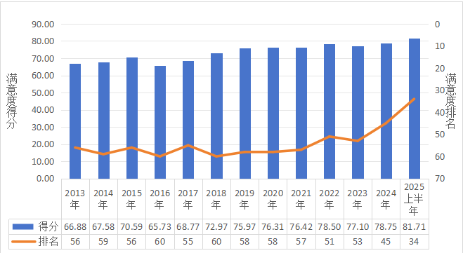 2013-2025上半年银川市国内游客满意度得分及排名