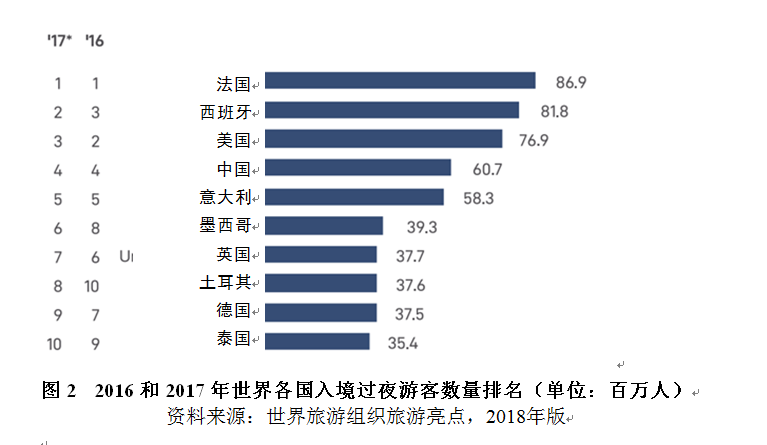 中国为世界给予了稳定增长的客流。根据世界旅游组织报告,亚太地区实现的旅游人数增长主要归功于稳定有力的区域内需求,中国为旅游市场的开展贡献最为突出。自2012年起,中国不断是全球最主要的出境旅游消费国之一。2017年,中国共接待国际入境过夜游客6074万人,排名世界第4,仅次于法国、西班牙和美国,增长率达到2.5%。2017年中国接待的国际游客占亚太地区总数的18.8%,旅游收入占亚太地区总量的8.4%。